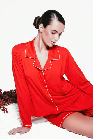 Shorts fragola, de Viscose, vermelho com detalhe do viés em rosa claro.