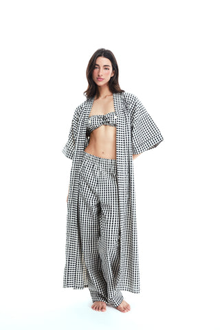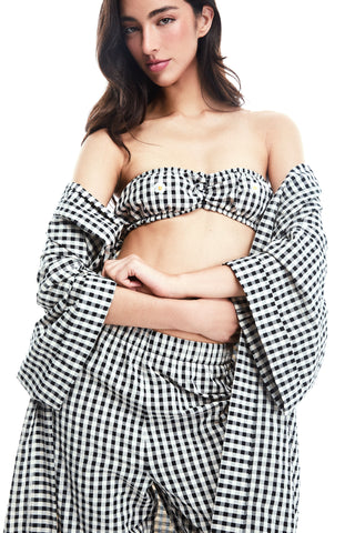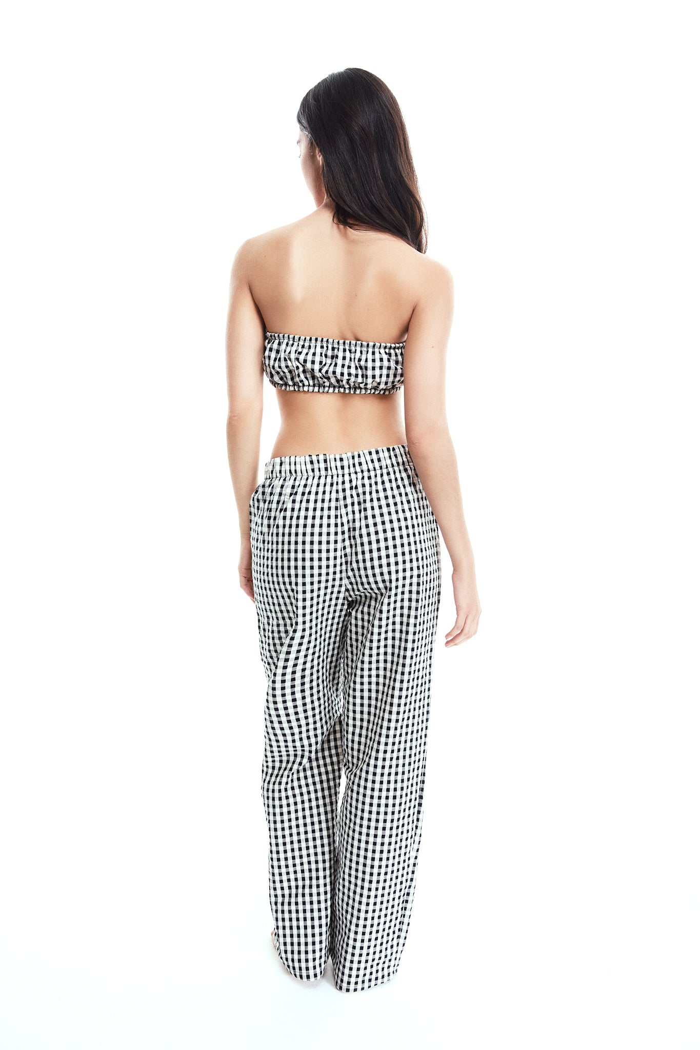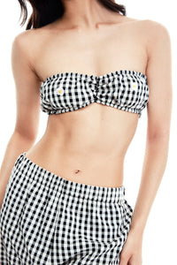 Top modelo faixa com tecido 100% algodão em padronagem "Vichy" e duas margaridas pequenas bordadas no centro do seio.